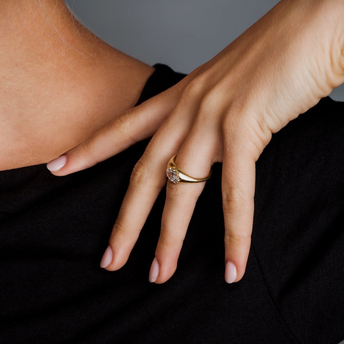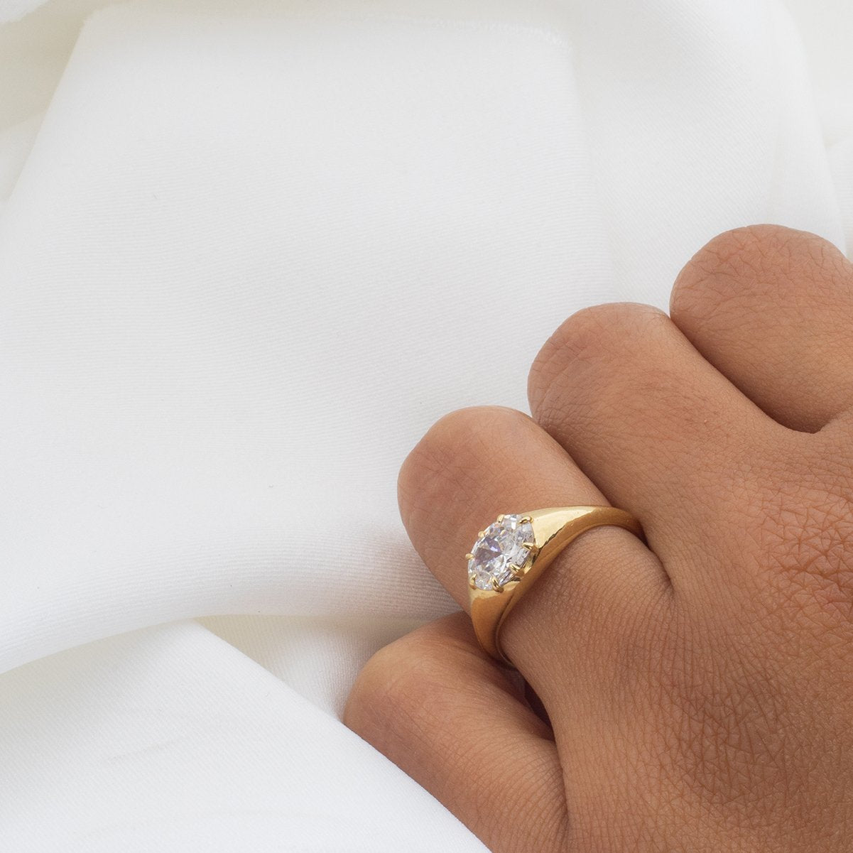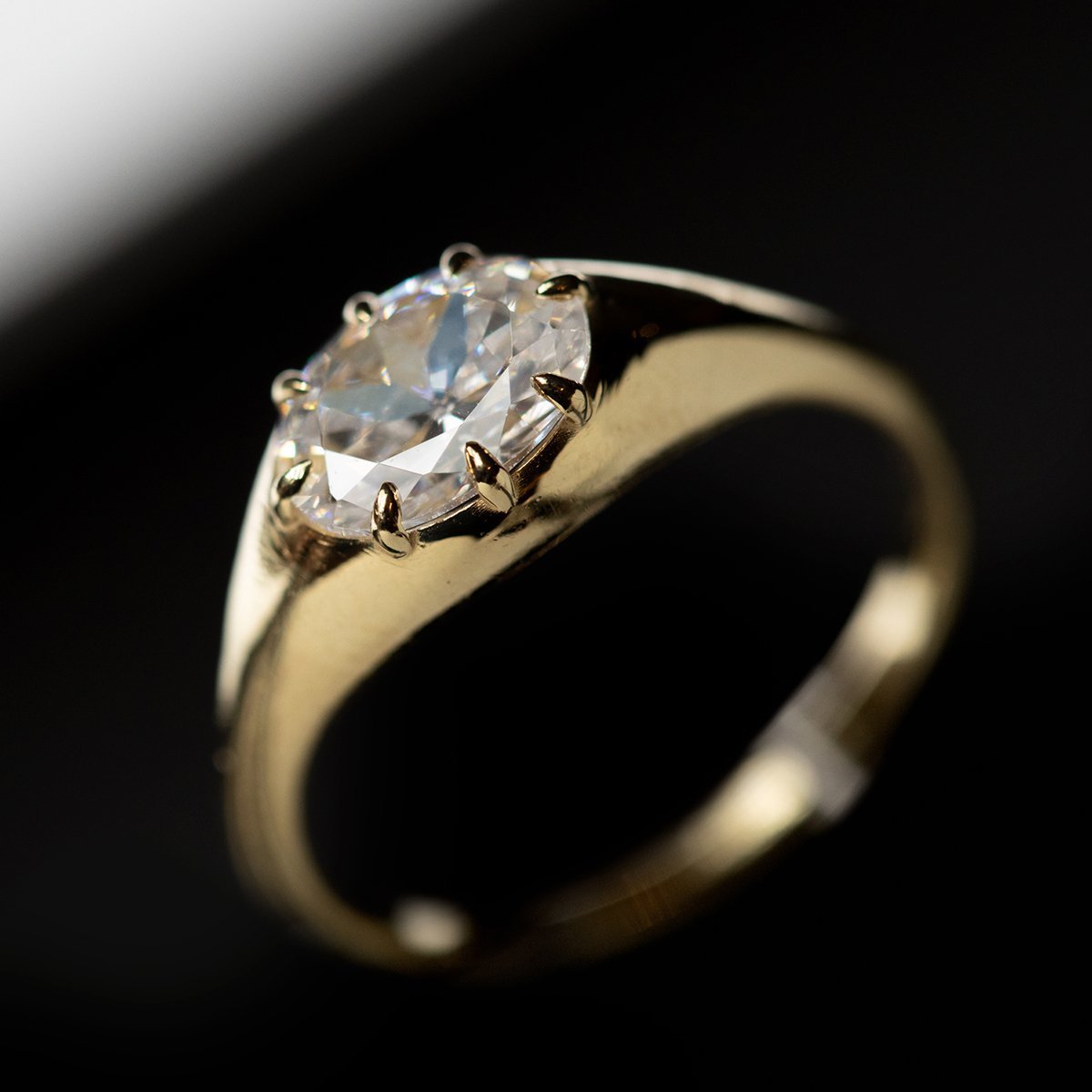 Evoking the classic signet style, this engagement ring features a brilliant cut oval diamond secured by eight clawed prongs, showcasing exceptional craftsmanship. Made with recycled gold, it reflects a commitment to sustainability and respect for the earth. The diamond measures approximately 1/8" in height, with the pictured stone weighing 1.0 carat. Each ring is made to order, with a delivery timeframe of 3-4 weeks, ensuring a personalized and thoughtful creation.